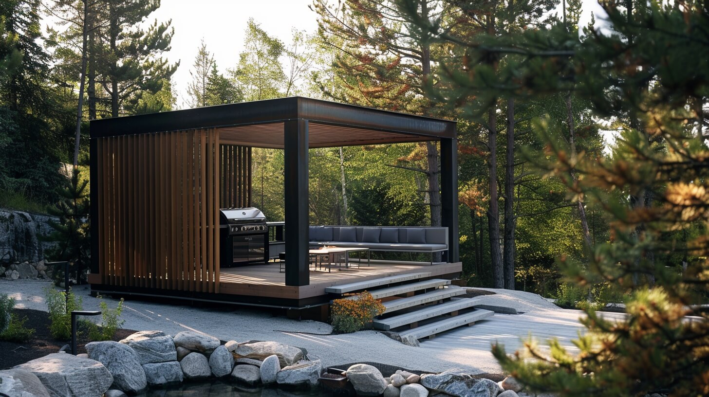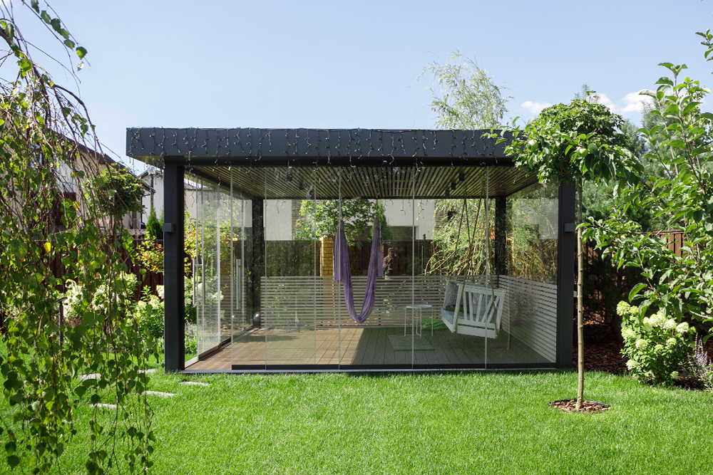 Наша главная задача - сделать вашу зону отдыха уютной и комфортной в любое время года, чтобы она стала вашим любимым местом отдыха с семьей и друзьями. Застекленная беседка с элементами отделки из дерева, камня в современном стиле станет прекрасным дополнением вашего участка.